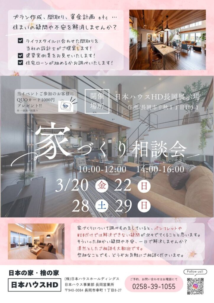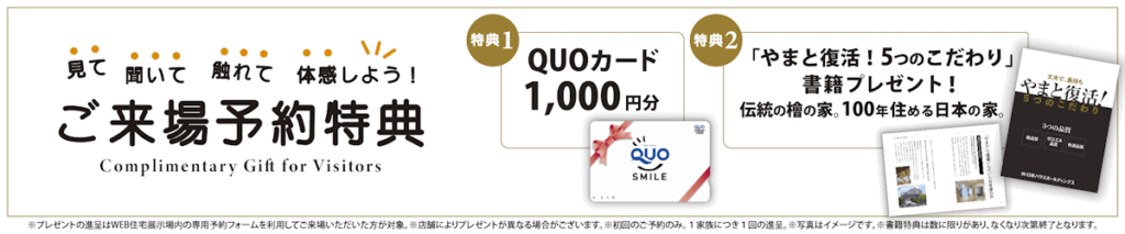 家づくり相談会にご参加いただきました方にはQUOカード1,000円分進呈します。合計でQUOカード2,000円分の進呈となります。
