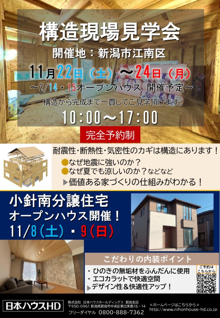 構造見学会&小針南分譲住宅見学会開催!11/22(土)~11/24(月)構造見学会開催11/8(土)・11/9(日)小針南分譲住宅見学会普段なかなか見ることの出来ない構造を見て価値のある家づくりの仕組みがわかる!また展示場では味わえないリアルサイズの家を体感してください!【見どころポイント!】※完全予約制となっております。ホームページまたは、お電話にてご予約下さい。